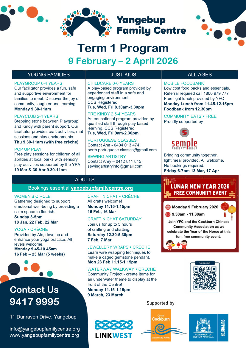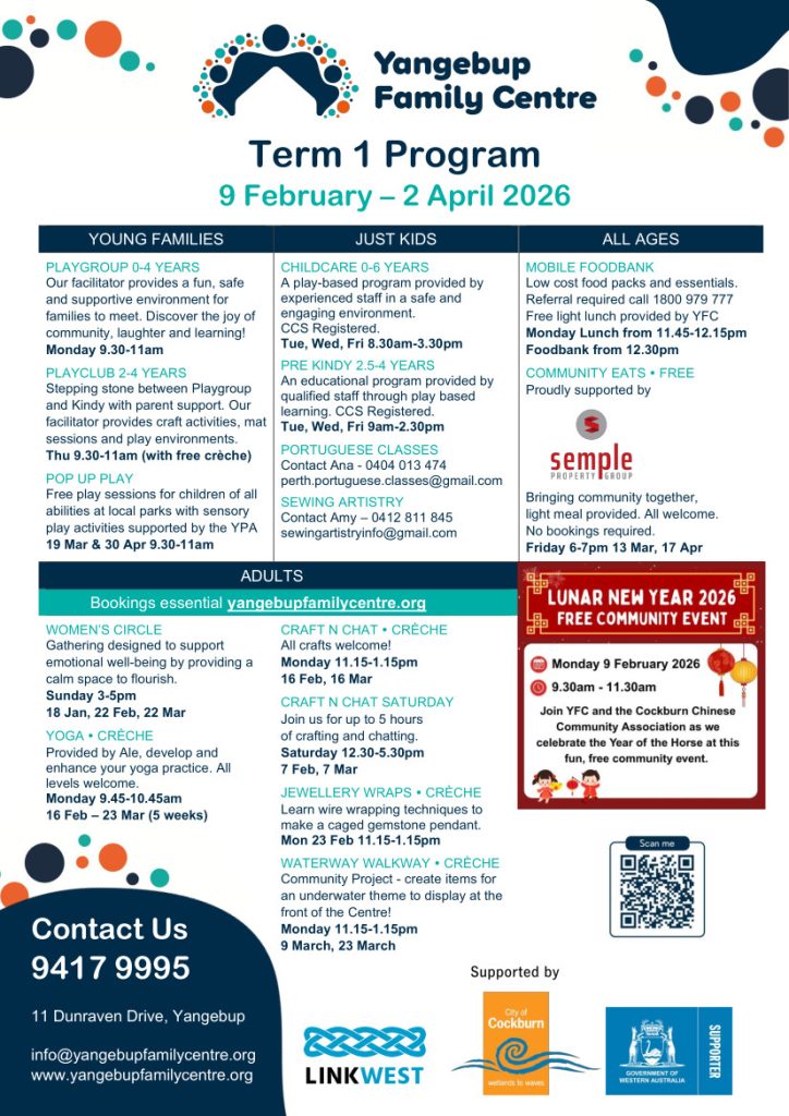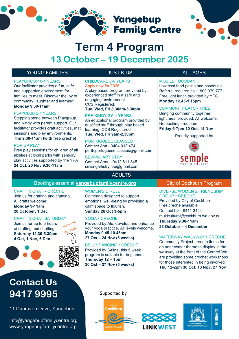 The Yangebup Family Centre provides a variety of workshops throughout the year in partnership with other organisations including St John Ambulance and the City of Cockburn.